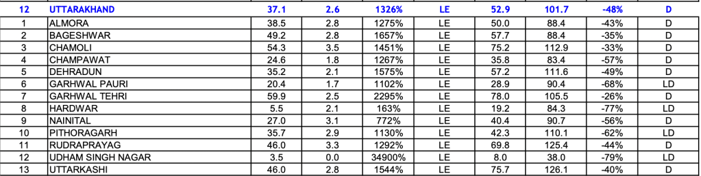 However, the figures of actual rainfall are possibly an underestimation to the extent that they do not fully include the snowfall figures. This is a major lacuna in IMD reporting rainfall figures from snowfall areas of Himalayan states. Reporting these figures on regular basis is also useful in understanding how the snowfall figures are changing. These can also help in some cases for assessing the possibility of avalanches. Currently SASE (Snow and Avalanche Study Establishment), now part of DGRE (Defence Geoinformatics Research Establishment) is supposed to be monitoring snowfall and avalanche possibilities, but all that information is not in public domain, though it needs to be as this is basic information necessary for all concerned.