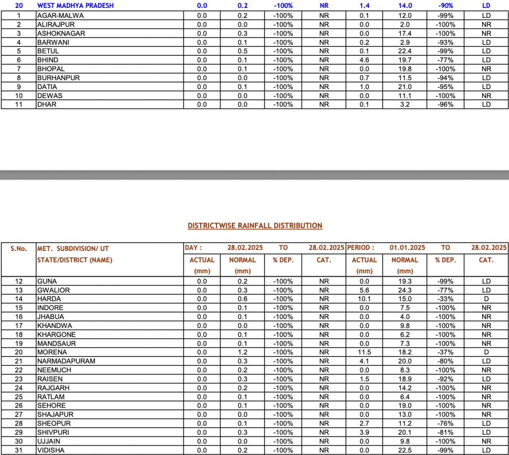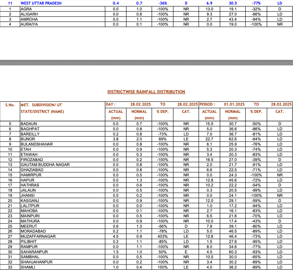 In this report we are giving detailed state wise and district wise figures of the rainfall for the 2024 winter season as reported by IMD. As can be seen from the IMD’s bar chart for winter 2025, the rainfall throughout the season remained well below the normal figure, in spite of a spike on Feb 21 and 28.