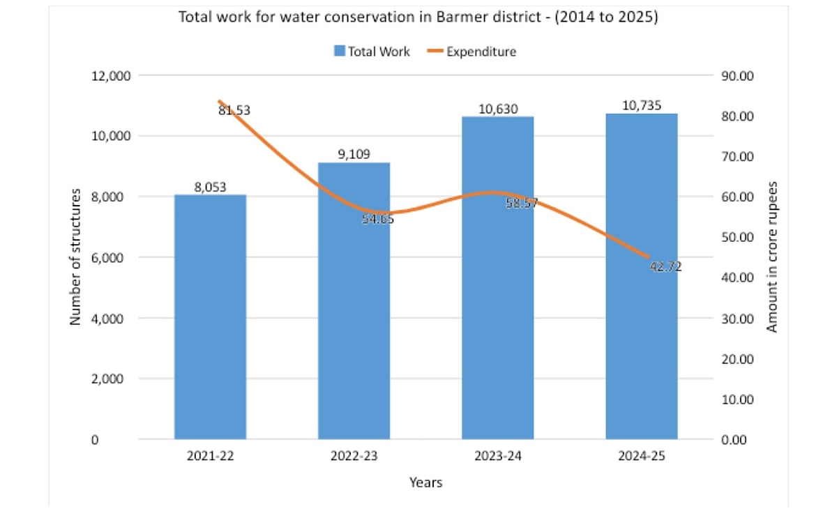 Rajasthan Barmer’s groundwater falling despite ₹1,500cr pumped in 3 years Rajasthan’s drought-prone Barmer district has the highest number of groundwater recharge structures built under the Jal Shakti Abhiyan scheme of the Union Ministry of Jal Shakti (water resources). The 47,000 structures consisting of rooftop rainwater harvesting, trenches, ponds, tanks and check dams from 2021-2024 were constucted at a cost of Rs 1,300 crore, according to the official dashboard for the scheme. This figure stands in stark contrast with the reality: