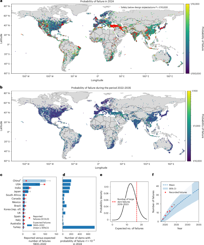 We uncover a trend of increased failure rates of newly constructed dams in low-income regions, which coincides with areas where a substantial hydropower potential remains untapped. This is especially intensified in monsoon-dominated climates, whereas the pattern of construction and failures is more homogeneous across other major climatic regions. Our statistical analysis suggests that 23 (95% confidence interval 14–33) large dam failures are to be expected worldwide in the near future (2023–2035), with currently ~4.4% of large dams having a probability of failure larger than 1/10,000. Contrarily, 85% of large dams are at least twice as safe as this threshold, commonly embraced in policy. These findings can support the targeted allocation of limited resources for the future-proofing of infrastructure, thereby contributing to water, food and energy security. https://www.nature.com/articles/s44221-025-00402-1 (07 March 2025)