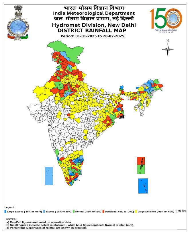 SANDRP Blog District wise Rainfall in India In the just concluded 2025 Winter Season (January 1 2025 to February 28 2025), as per India Meteorological Department (IMD), India received 47% below Normal Rainfall (it was 33% below normal in winter 2024, it was 45% below normal in winter 2023, 44% above normal rainfall in winter 2022 and 32% below normal rainfall in winter 2021). This is coming on top of 8% above normal in SW Monsoon 2024 and 3% below normal rainfall in Post Monsoon season 2024. The Normal rainfall in this two-month Winter season is supposed to be quite low at 39.8 mm, but the actual rainfall was 20.9 mm in winter 2025. https://sandrp.in/2025/03/08/winter-2025-district-wise-rainfall-in-india/ (08 Mar. 2025)