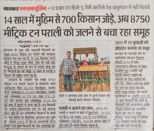 2. Haryana Interesting story of farmers of Tarawadi village in Karnal district who are not burning the crop residue. 700 farmers are mulching the 8750 tons of crop residue into the land since 2010-11, now for 14 years. The group led by Vishal Chaudhary is called Society for conservation of natural resources and empowering Rural Youth. (DRP NB 041124)