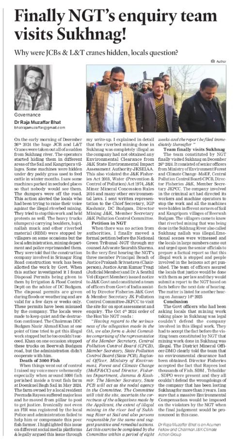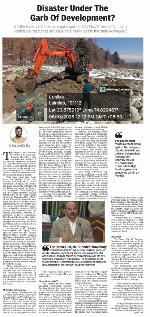 I had sought National Green Tribunal’s -NGT’s intervention in 2022 when a road construction company namely NKC Projects Pvt Ltd started looting Shali Ganga a small stream in Budgam district of Kashmir in violation of Guidelines of J&K Environmental Impact Assessment Authority-JKIA which prohibits use of heavy machinery like JCBs, L&T Poclain Cranes. The loot was immense and NGT in Sept 2022 banned the company from excavating riverbed material-RBM (Boulders, Bajri, Gravel, Sand etc).
