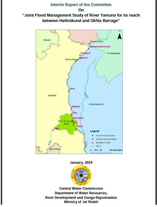 Post July 2023 unusual flood spell in Yamuna river reaching unprecedented levels in Delhi, the Ministry of Jal Shakti (MoJS) on August 06, 2023, constituted a committee for conducting a “Joint flood management study of river Yamuna for its reach between Hathnikund and Okhla Barrage”. The Committee headed by Chairman, Central Water Commission (CWC) & Ex-Officio Secretary to Govt of India with members from Haryana, Uttar Pradesh, NCT of Delhi and expert Organizations was mandated to examine the meteorological aspects, return period of floods, discharging capacity of barrages, functional requirement of ITO barrage, etc.