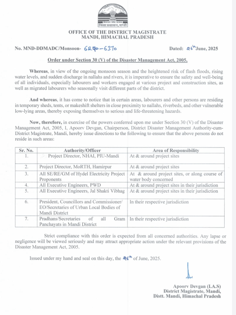 Post Script 2: On June 26 2025, District Magistrate and Chair of District Disaster Management Authority of Mandi district has brought out an order directing all concerned including hydropower developers to ensure that workers do not stay in life threatening locations like riverbanks.