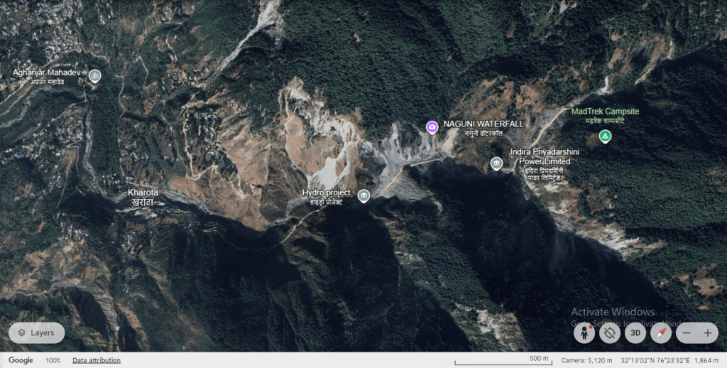 It is worth mentioning that on February 28, 2025, some tippers and JCB machines engaged in mining work were trapped in the stream in sudden rise of water level in the stream. The Google Earth imagery also shows large landslide scars along the stream in the project area. It also shows at least 3 hydro projects Priyadarshini, 1 Mw Lungta-Naguni (Status unknown) and existing 3.5 Mw Munani HEP (Commissioned in April 2017, Power house at Kharota) along about 2.5 km stretch of the stream. There is no information available about impact of the deluge on the other hydro projects.