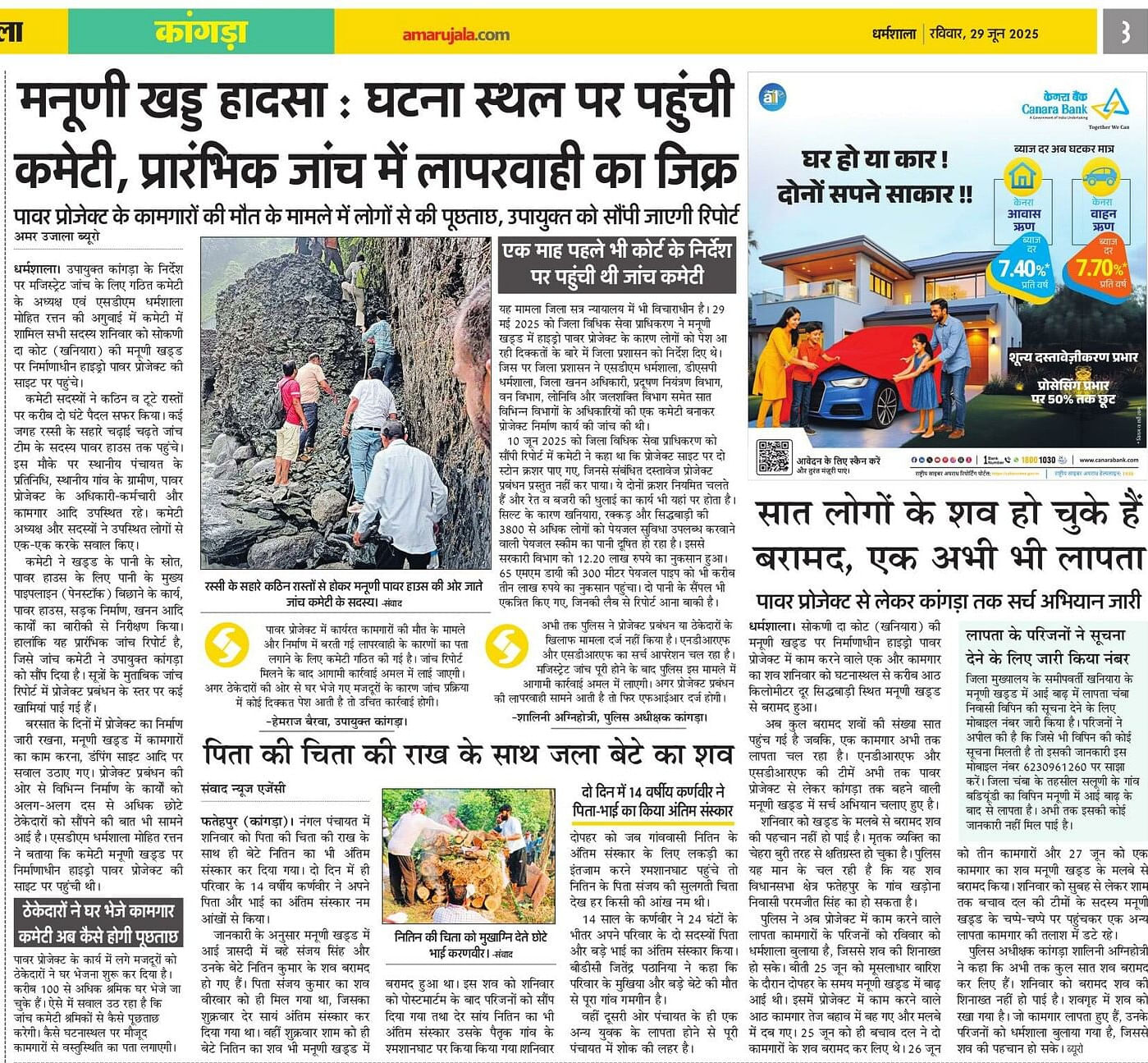 With recovery of one more dead body, the death toll has increased to seven. The dead body was found around 8 km downstream in Siddhbadi along the stream on June 28, 2025. One worker is still missing. The investigation team reached the powerhouse site and inspected water source, pen stock, road construction and mining work done by the project company. The team has found violation of some norms and raised questions regarding work being done during monsoon in riverbed, dump site of the project. They will prepare initial inquiry report and hand it over to DC. So far, the administration has not filed any case against project company and contractors.