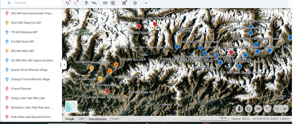 Bhut Nalla Basin where Machail and Chasoti lie, has an area of 390 sq kms and is home to 90 glaciers[i]. In 18 years between 1993-2021, glacial area of Bhut Nalla basin has decreased, number of glaciers have increased (indicating fragmentation of glaciers) with average glacial retreat of 11 meters/year. This is in keeping with rapid retreat of glaciers in Chenab Valley. (See Our report: https://storymaps.arcgis.com/stories/ba82aadda7114d5b862fc8c48c1ad56b)