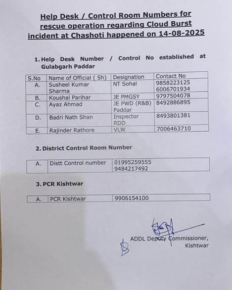 Helpline Numbers Chasoti/ GulabGarh/Kishtwar