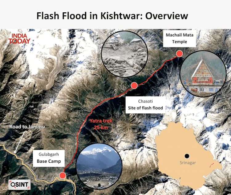 Chasoti village is a small settlement that serves as a base camp for Machail Mata yatra. For a remote region, this village in South Jammu is startlingly populated with homes and guest houses close to the Chasoti or Jasnai Nalla. Most of the makeshift shops, community kitchens, a security camp and parking areas have been washed away by the flood. The annual event reportedly attracts nearly 300,000 pilgrims. The Machail Mata Yatra, which began on July 25 and was scheduled to end Sept. 5, has been suspended. Officials have urged people to avoid the area until conditions improve.