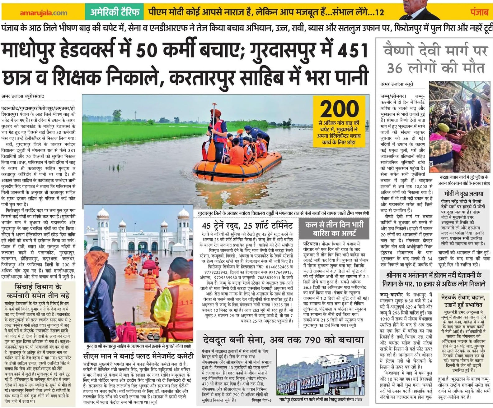 The Jawahar Navodaya Vidyalaya at Daburi in Gurdaspur was flooded severely trapping around 400 students and 40 staff members in the school building who were finally rescued after a day-long operation. Ravi floods entered about 40 villagers after breach in Dhussi embankment at three locations in the Ajnala and Ramdass areas of Amritsar district.