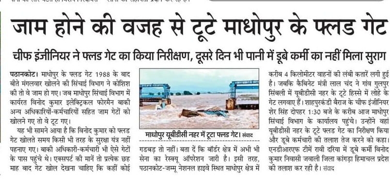 Why Gates Were Jammed Sher Singh, Chief Engineer, Shahpur Kandi project reached there to inspect flood impact on the barrage and UBDC on Aug 28. Without any official information, the report suggests that the jamming of the gates resulted in their breaking away. It also states the operators were not given any safety equipment and the search was going on for the missing staff Vinod Kumar a resident of Kangra, Himachal Pradesh.