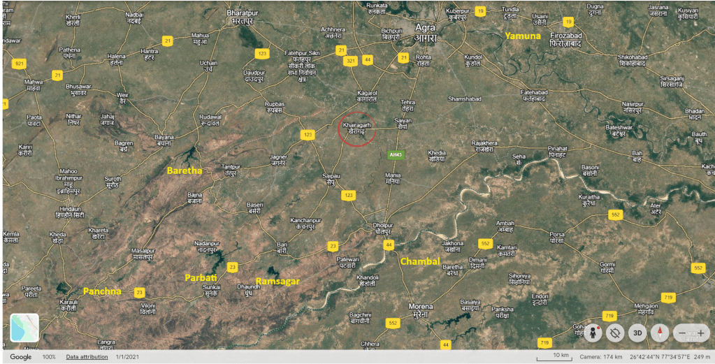 Utangan River also known as Gambhir river originates from Aravali hills near Hindaun city in Kirauli district of Rajasthan. The river has a catchment area of 4316 sq km. It flows for 288 km before merging into Yamuna near Rihauli village under Bah tehsil of Agra. For a long distance the river forms boundary between Rajasthan and Uttar Pradesh.