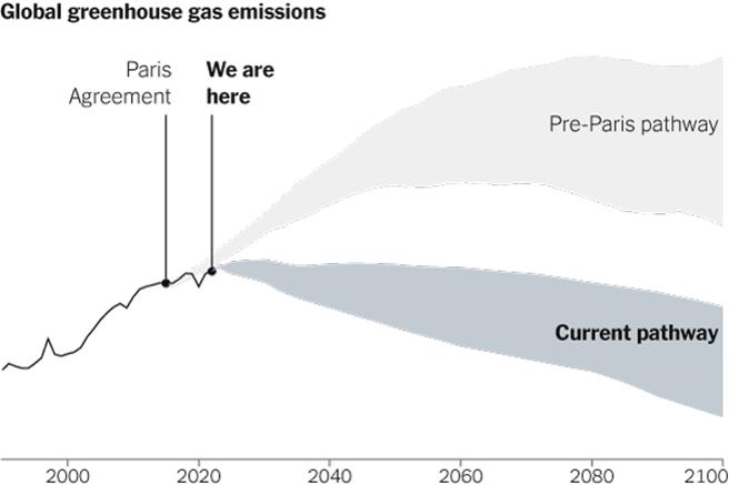 However, The New York Times is a bit more positive. It says: “The good-ish news: Slower emissions growth (over the last decade) means the arc of temperature increase has curved downward over the past 10 years. If countries stick to current policies, the global average temperature is projected to rise by 2.5 to 2.9 degrees Celsius by the end of the century — still bad, but a significant improvement from where we were 10 years ago. These charts show 10 big things that have happened on the climate front in the last decade.”