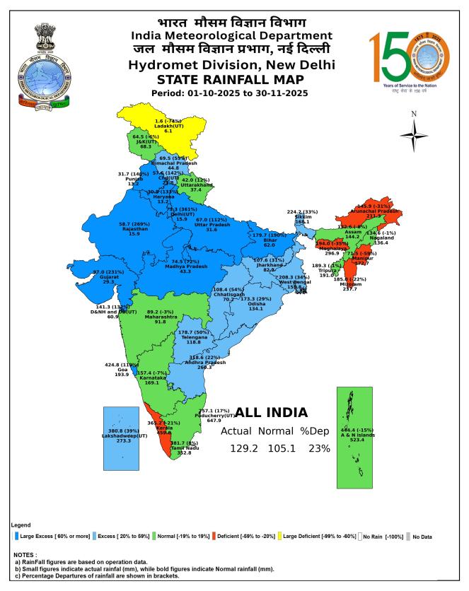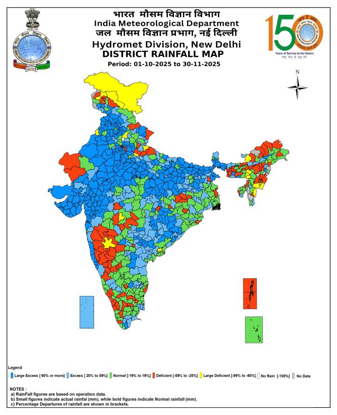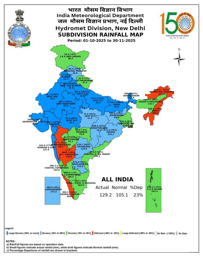 IMD’s cumulative state, sub-division and district wise rainfall maps for the period of Oct. 01 to Nov. 30, 2025.