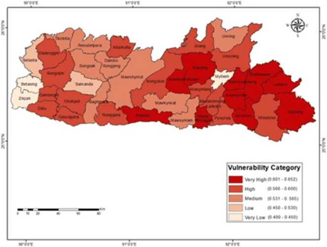 First block level climate vulnerability assessment in Meghalaya shows 25 blocks in high or very high vulnerability categories According to a new study 25 out of 39 Community & Rural Development (C&RD) Blocks in Meghalaya fall under the high or very high climate vulnerability categories. The Meghalaya Climate Change Centre (MCCC) has conducted a comprehensive block-level climate vulnerability assessment covering the 39 Community & Rural Development (C&RD) Blocks of the State under NMSHE. The study adopts a common national framework to integrate biophysical and socio-economic indicators through a tiered, top-down approach.