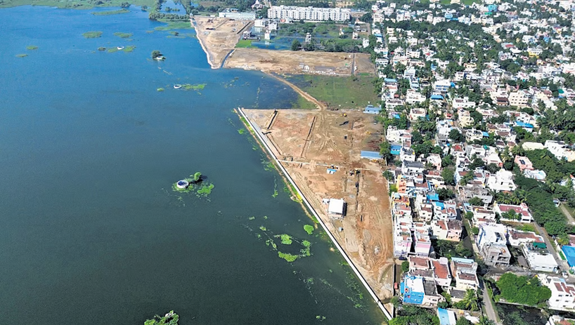 (Feature Image: An aerial shot of Madambakkam lake in Chengalpattu district, Tamil Nadu shows buildings on the banks of the waterbody: Source)