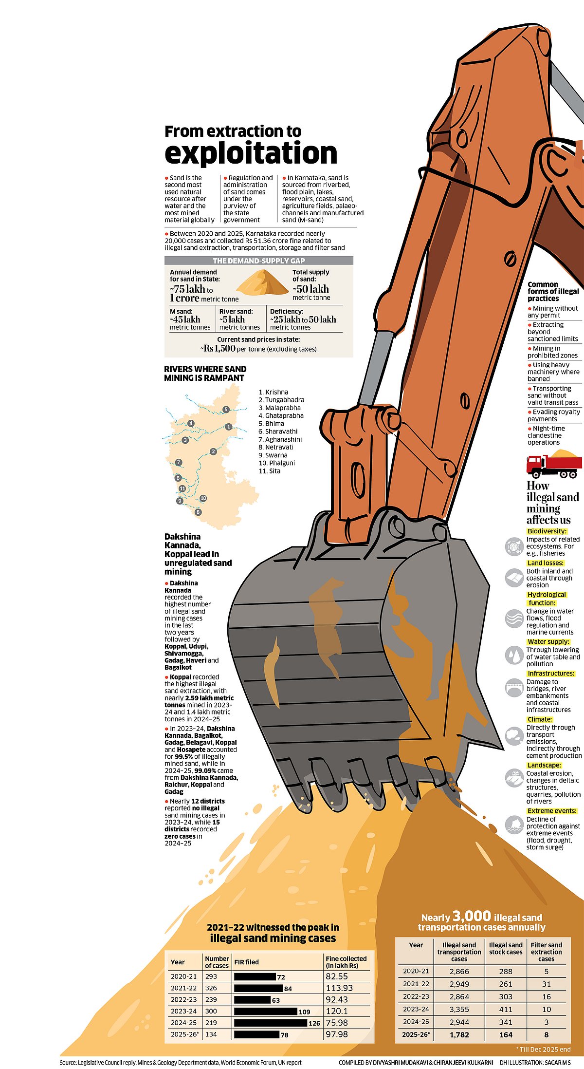 Illegal sand mining is common along the basins of the Krishna, Tungabhadra, Ghataprabha, Malaprabha, Bhima, Vedavati, Netravati, Panchagangavali, Sita, Hemavati and Kaveri rivers. It also occurs on numerous streams across 18 districts. It has a cascading impact on revenue, livelihoods and the environment in these regions.
