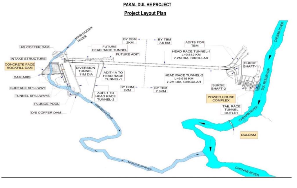The foundation stone of the Pakal Dul HEP was laid in May 2018. The project involves construction of 167-meter-high concrete face rock fill dam, two HRTs measuring 7.2 meter in diameter and 9.6 km in length and an underground power house.