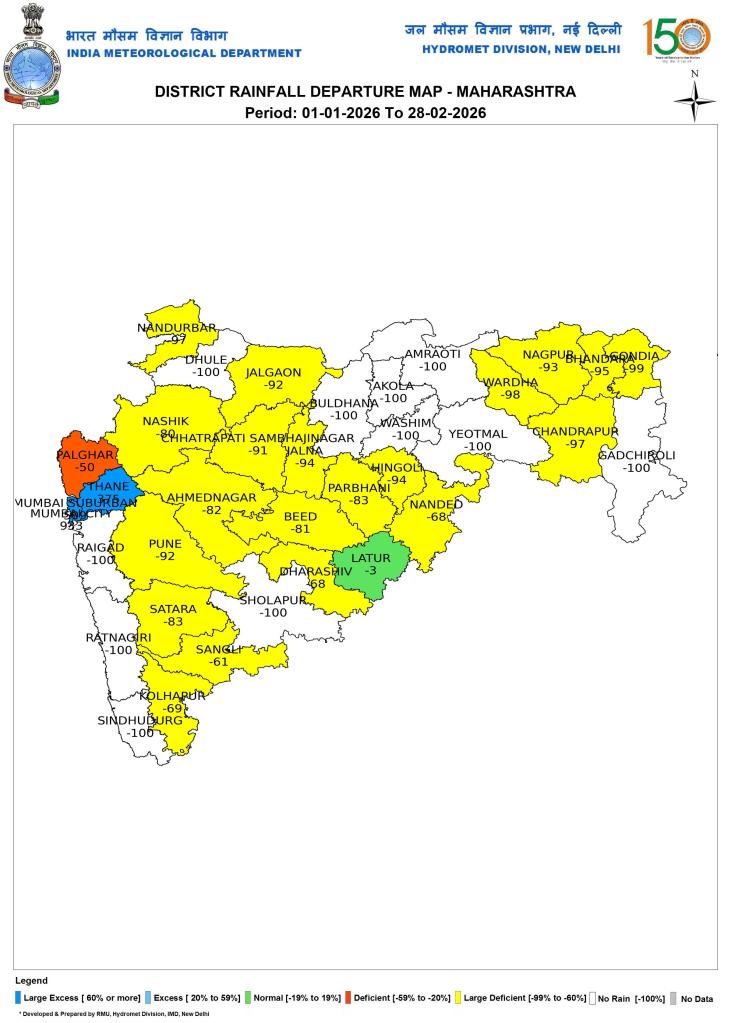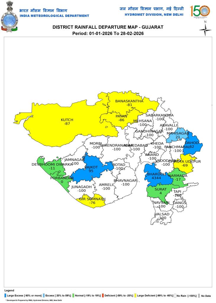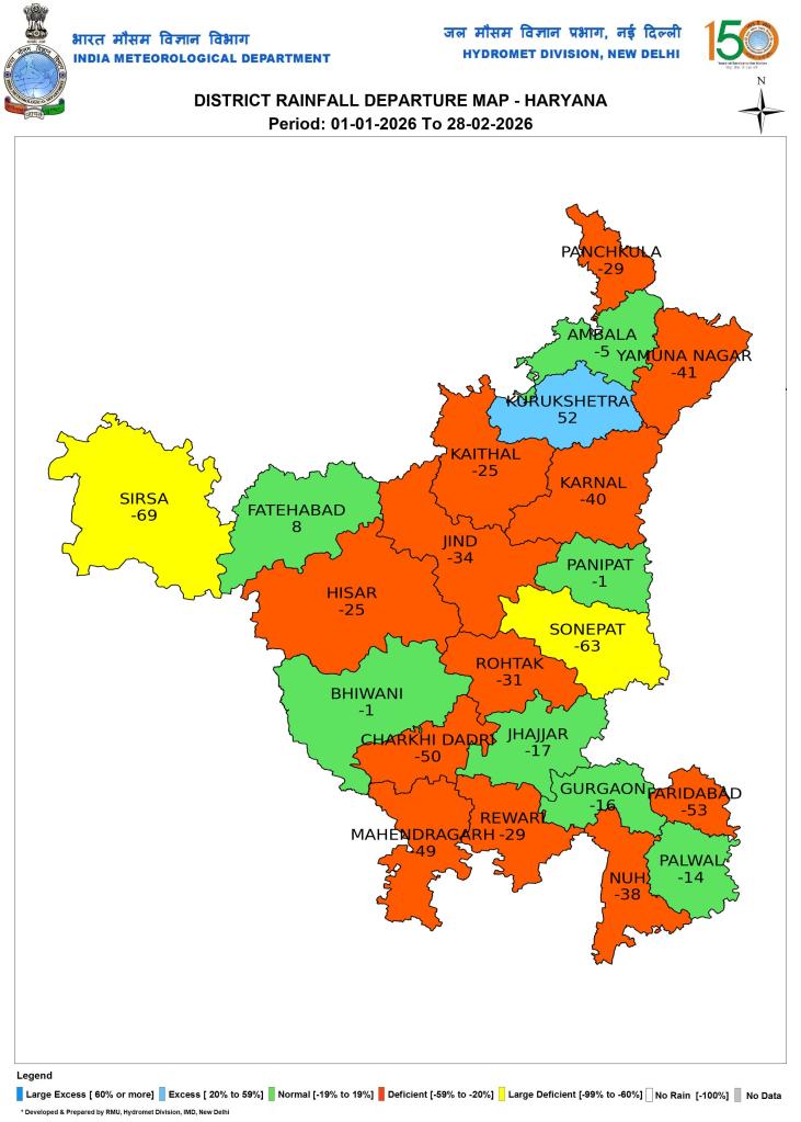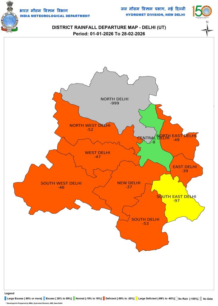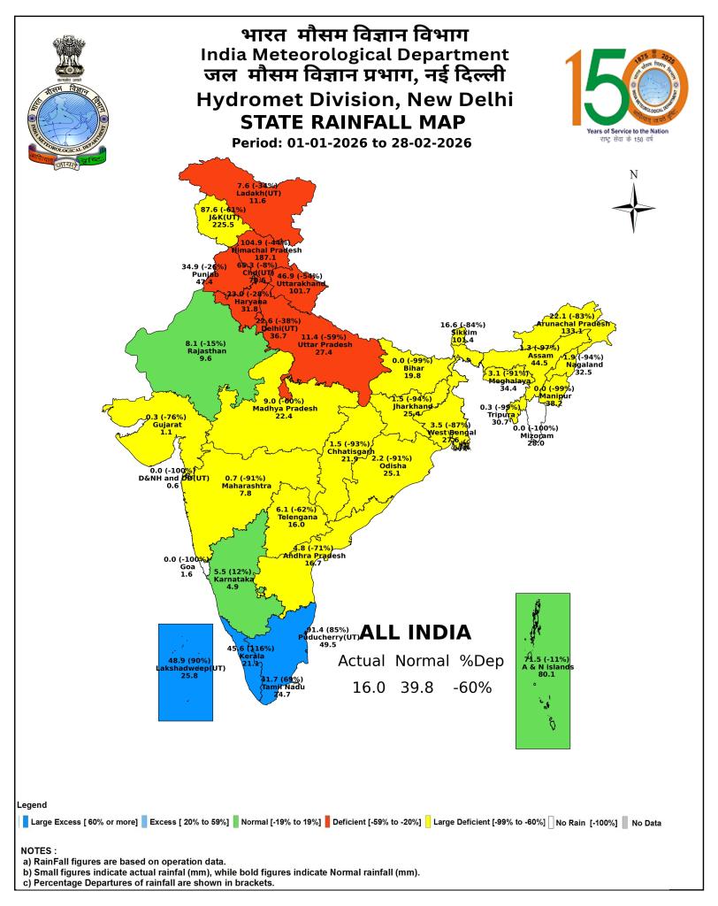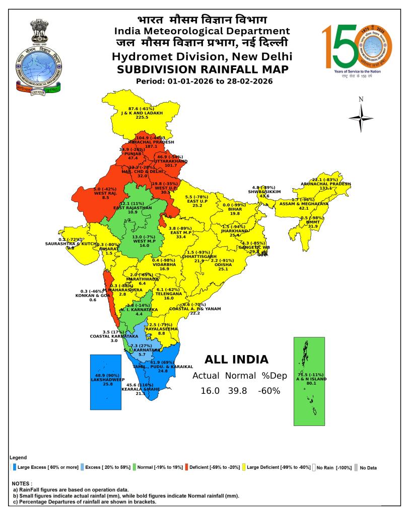 In the 2026 Winter Season (January 1 2026 to February 28 2026), as per India Meteorological Department (IMD), India received 60% below Normal Rainfall (it was 47% below normal in winter 2025[i], 33% below normal in winter 2024[ii], it was 45% below normal in winter 2023[iii], 44% above normal rainfall in winter 2022[iv] and 32% below normal rainfall in winter 2021[v]). In five of the last six years since 2021, winter rainfall has been 32% or more below normal.