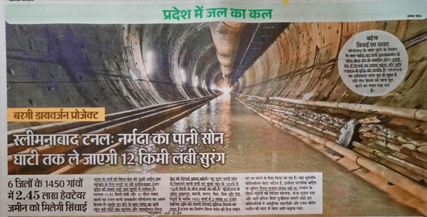Bargi Diversion Project under construction The 11.95 km long and 10 m dia Slimanabad tunnel to connect Narmada and Sone basins across Vindhya range is under construction. It is aimed at achieving irrigation in 2.45 lakh ha in 1450 villages of six districts including Panna, Jabalpur, Katni, Satna, Mehar, Rewa. It will thus transfer water from Narmada (considered a deficit basin in Inter Linking of Rivers Scheme) to Ganga (supposed to be a surplus basin). Reminds one of what Anupamji would call Ulti Ganga! What impacts it will have on the Narmda downstream areas is a question.