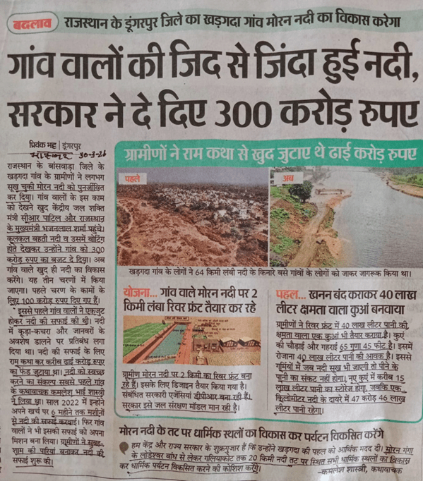 Banswada Village rejuvenates Moran River Starting from 2022, people of Khadagda village in Banswada district (Rajasthan) as per this report in Dainik Bhaskar of March 31 2026, have taken up the task of cleaning and rejuvenation of Moran River. Now Union Jal Shakti Minister and Rajasthan Chief Minister visited the village, appreciated the effort and provided more funds.