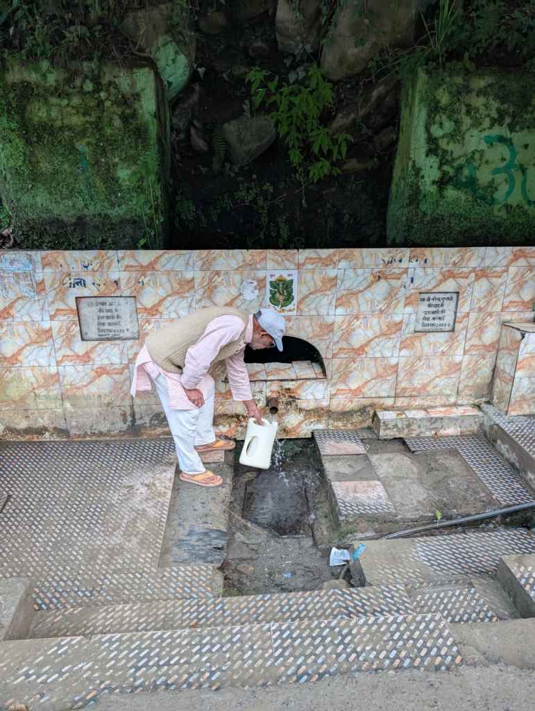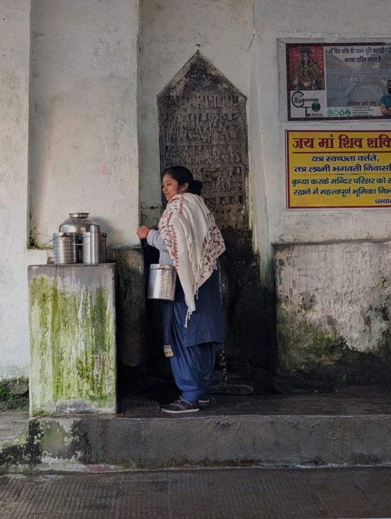 As we walked through this leafy village, we watched the panihars breathe with the village’s daily rhythm. At the biggest panihar, across from the Shiv Shakti Temple, a schoolboy filled his water bottle, followed by a brightly dressed woman with several steel flasks, then a busy shepherdess who drank her fill. “This place gets crowded in the evening, so I’m here a bit early today,” said a woman hurrying along with her flasks.