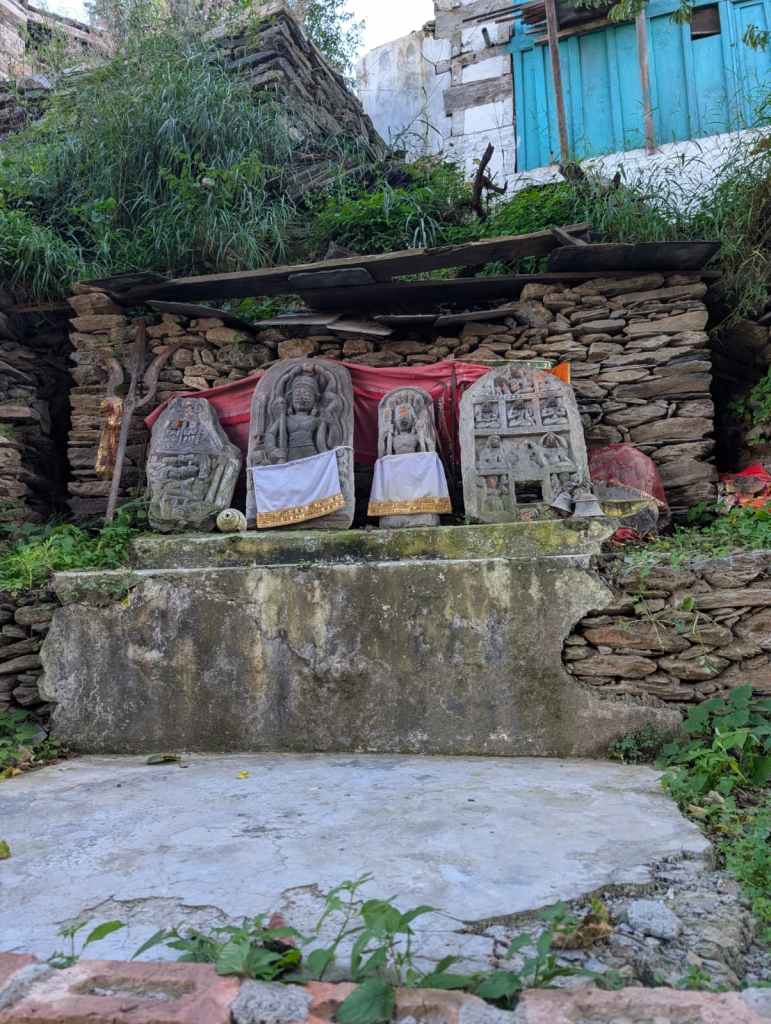 Avinash takes us to a small and modest shrine next to a Panihar and tells us the lore of the place: “The story goes that a seeker meditated in our village. Once, his disciple descended to the Ravi to fetch water, as there were no water sources in the village. But on his climb back, he was mauled by a bear and died. In rage, the grieving seeker struck the earth thirty-six times with his trident, and water erupted from every strike, giving the village its name, Chhatradi, which means thirty-six.”
