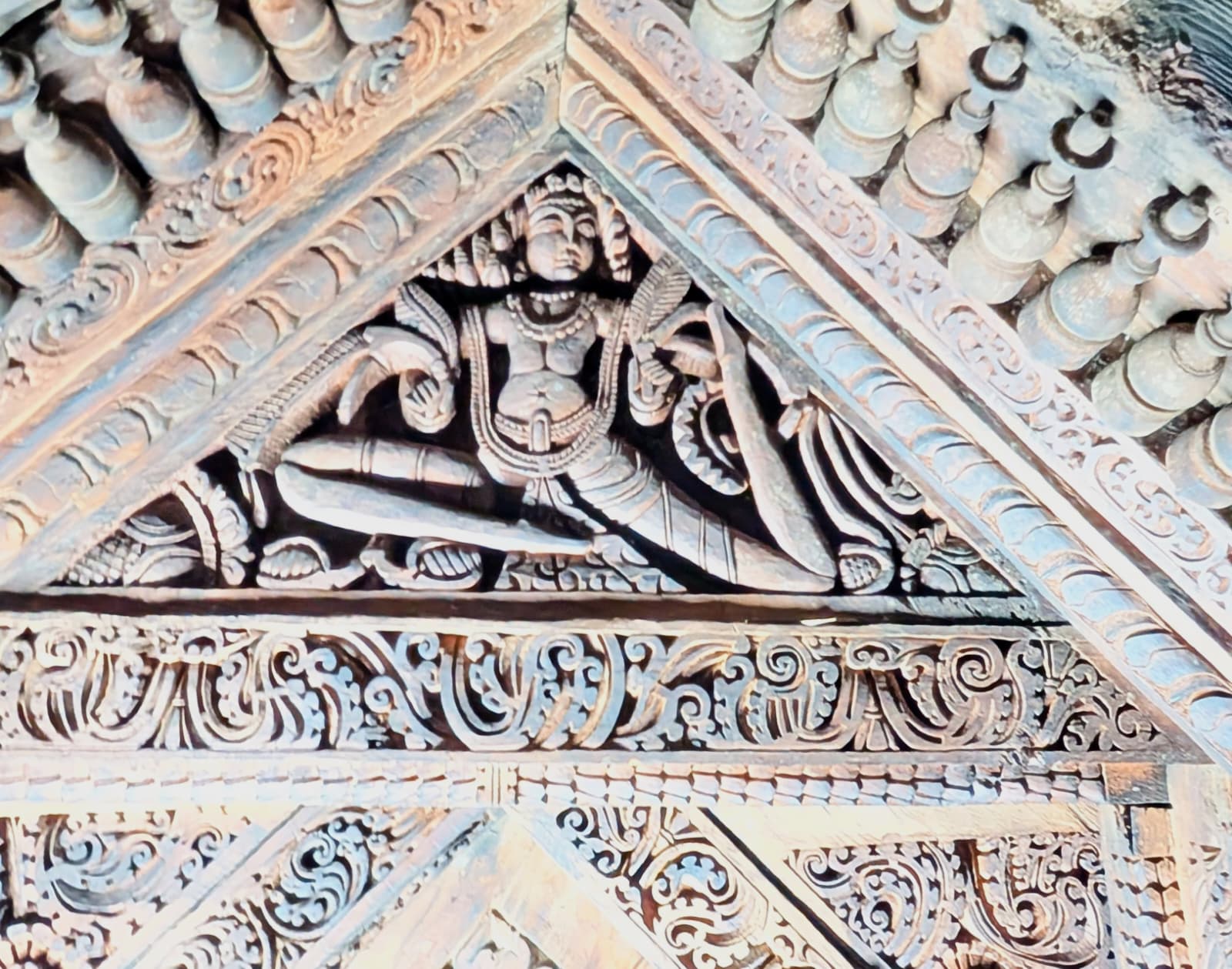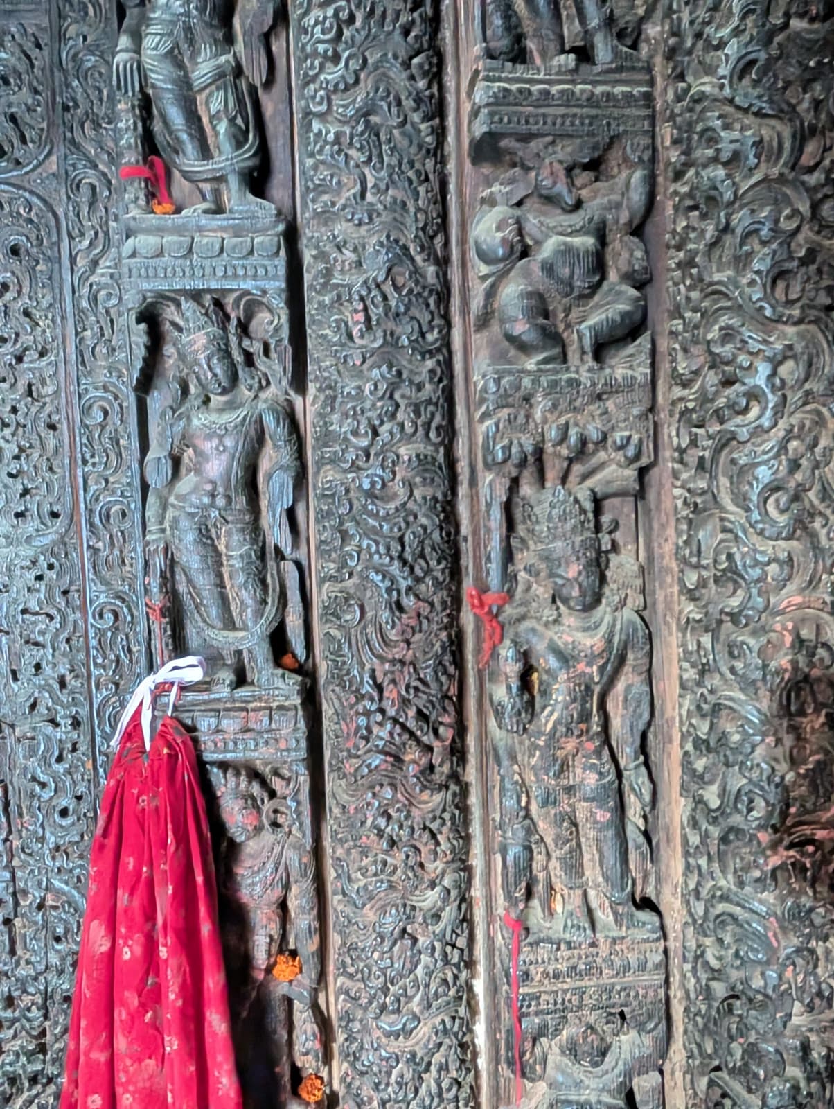 The largest panihar holds seven fountain slabs, each with a different story carved on them. Below the intricate carvings are spouts in the shape of a lotus or Makar, from where water gushes out. While the largest panihar has the story of Vishnu carved on it, the neighbouring one is homage to Lord Varun, the god of rain and rivers. Other reliefs depict Navagrahas (the nine planets), departed beloveds, and devotees in worship of Shiva. Below the fountains are troughs which collect some of the flow for washing clothes and for animals.