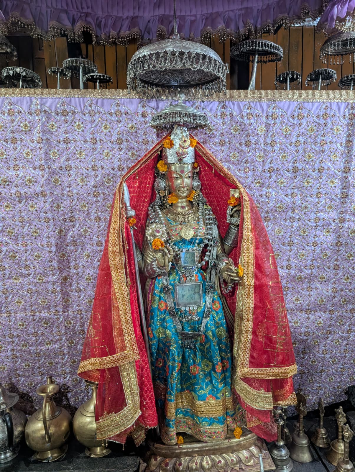 In the sanctum sanctorum of the temple stands a slender, 4-foot-6-inch brass statue of Goddess Shakti, framed by Gandharvas, Airavat and river goddesses Ganga and Yamuna. The temple complex is crowded with thousands of devotees during the famed Manimahesh Pilgrimage.