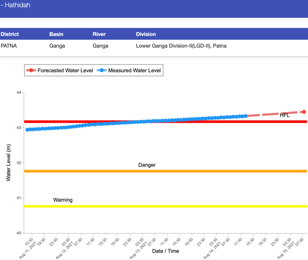 As India prepares to celebrate 75th Independence day on August 15, 2021, large parts of Bihar along the Ganga river, including Patna (flood water entered colonies near Ganga in Patna) and Bhagalpur are preparing to face unprecedented floods. In fact, Central Water Commission’s (CWC) flood monitoring site at Hathidah in Patna district crossed the HIGHEST FLOOD LEVEL (HFL) of 43.17 m at 0300 hours in early morning on Aug 13, 2021. The water level is already at 43.33 m at 1300 hrs on Aug 14. It is forecast to reach 43.45 m by 0800 on independence day still with rising trend. This is apparent from the CWC hydrograph of this site shown above.