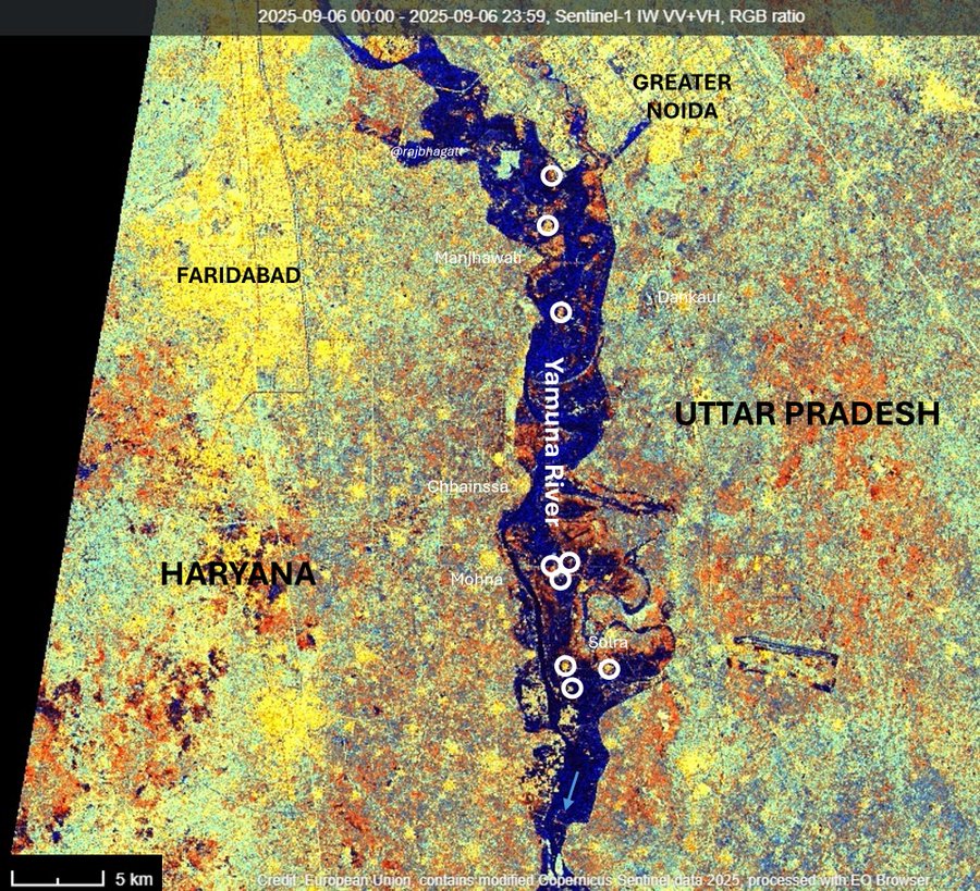 (Feature Image: Sept. 06, satellite image showing Yamuna flood spread downstream Delhi. Credit: Raj Bhagat P)