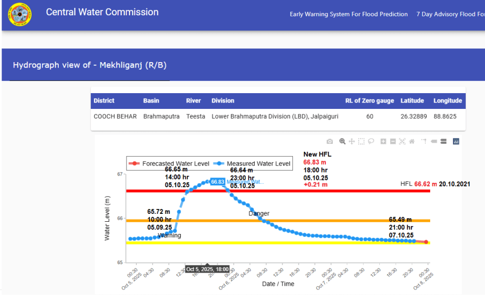 In Oct. 2025, we could find at least 06 flood monitoring sites of Central Water Commission (CWC), where rivers have crossed their Highest Flood Levels (HFL) after the end of South West Monsoon season 2025 on Sept 30 2025. Of the 6 sites, 2 each are in Brahmaputra basin in W Bengal and Ganga basin in Bihar. 1 site Anantharam on Musi river in Telangana is part of Krishna basin and 1 site Marella on Gundlakamma river in Andhra Pradesh is part of East Flowing Rivers between Mahandi and Pennar basin.