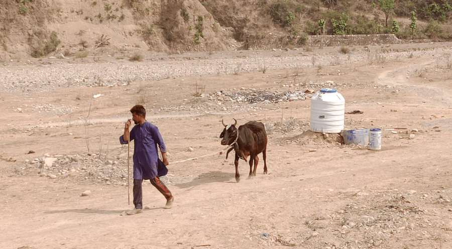 (Feature Image: A villager is taking his cattle through the bone-dry Nimi River, a tributary of Tons in Dehradun after feeding it water from a syntex tank placed in riverbed. The tank is filled with groundwater by a submersible installed on the bank of the river. B. S. Rawat/SANDRP/May 2024)
