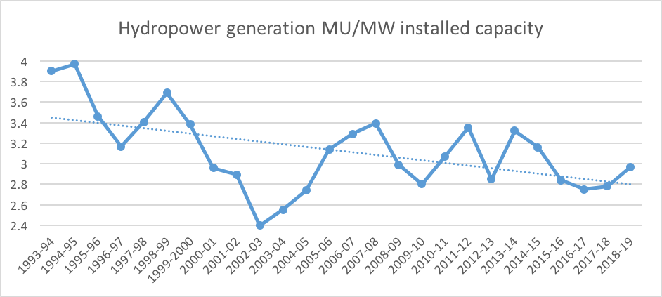 Above: Graph showing how the power generation per MW installed Hydro Capacity has been doing down over the last two decades