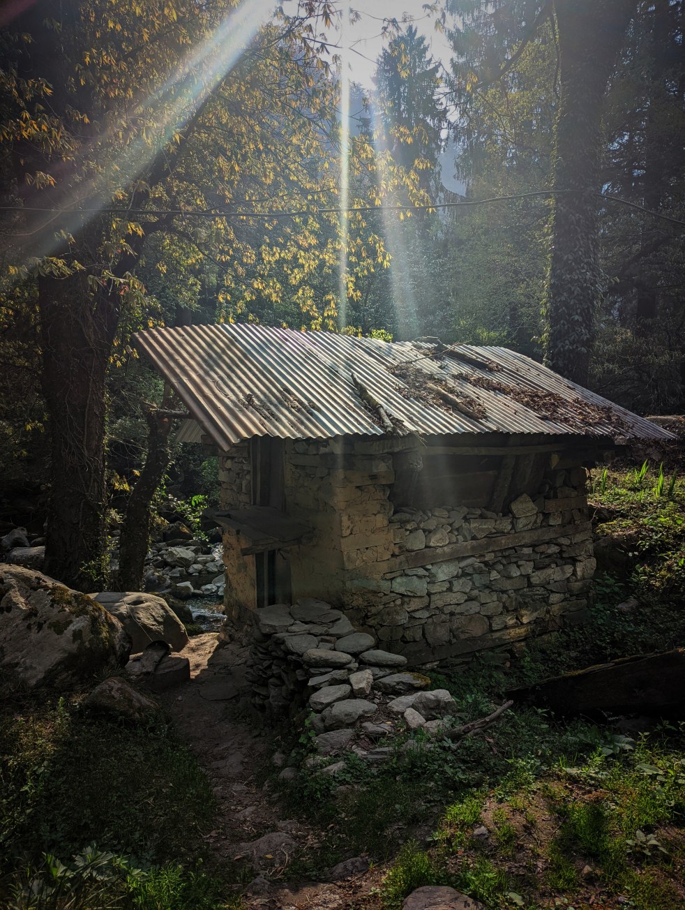 In the Tirthan Valley of Himachal Pradesh, as we crisscrossed tiny wheat fields moist with dew and apple orchards laden with white blossoms, a rhythm accompanied the steps: a constant ghrr-ghrr-ghrr. It came from small slate shelters with sloping roofs, which looked like tiny shrines. Sometimes, the shelters were made directly over a stream, but many times they were on the banks, with a channel diverting some water to them.