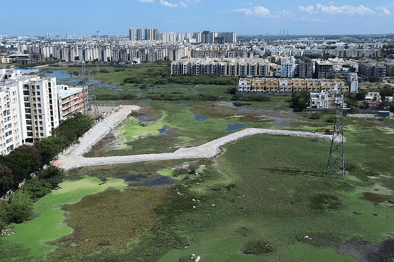 (Feature Image: A road is being laid allegedly by a private realtor inside the Perumbakkam marshland. Photo Credit: TNIE, June 2023)