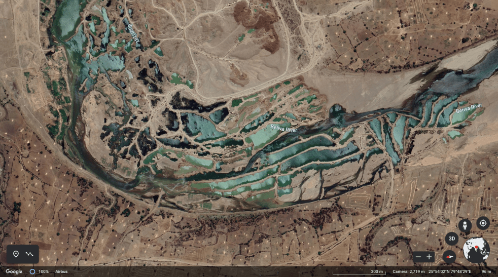 (Feature Image: Screen shot of undated google earth image showing multiple vertical, horizontal bunds created by deep, mechanized riverbed mining across Betwa near Bheri Dariya in Sarila tehsil of Hamirpur district.)