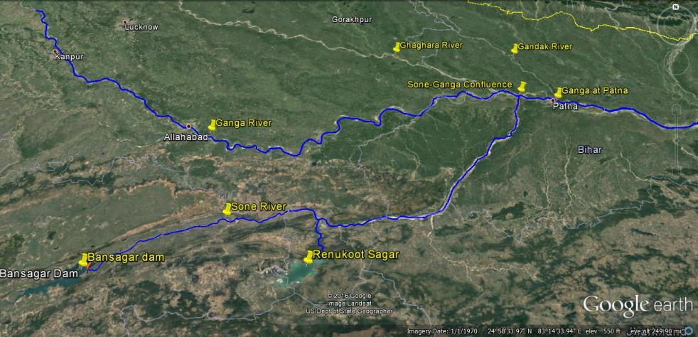 बाणसागर बाॅध, सोन नदी, गंगा नदी और पटना को दर्शाता मानचित्र