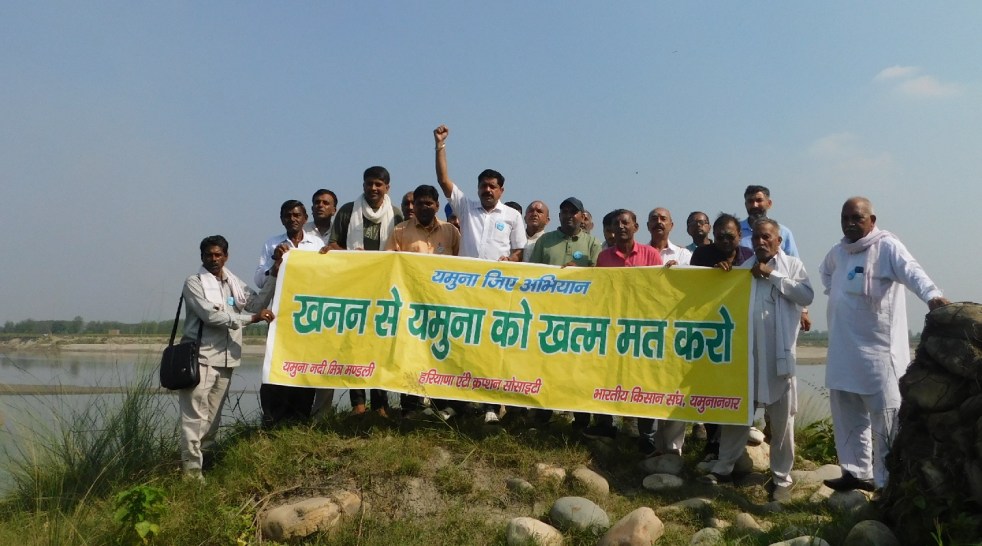 (Feature: Members of Haryana Anti Corruption Society, Yamuna Nadi Mitra Mandli, Bhartiya Kisan Sangh, Yamuna Nagar raising concerns over unabated unsustainable riverbed mining in Yamuna in Gumthala Rao, Karnal on Oct 07, 2024.)