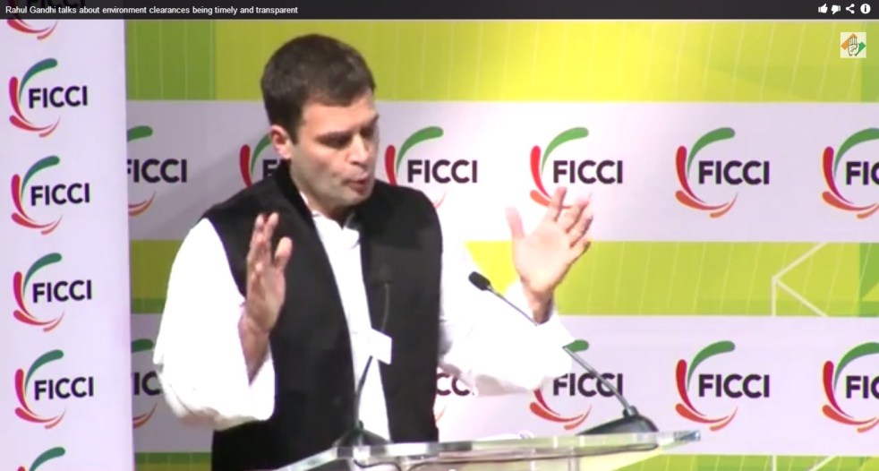 On December 21, 2013, Congress Vice President Rahul Gandhi said at a FICCI meeting (see the video of this clip uploaded by Indian National Congress: http://www.youtube.com/watch?v=URnr8OKTygg), “Many of you expressed your frustrations with environmental clearances that they are delaying projects unduly. There is excessive administrative and judicial discretion. The loopholes are so big that you can drive a truck through some of them. Environmental and social damage must be avoided, but decisions must also be transparent, timely and fair.”