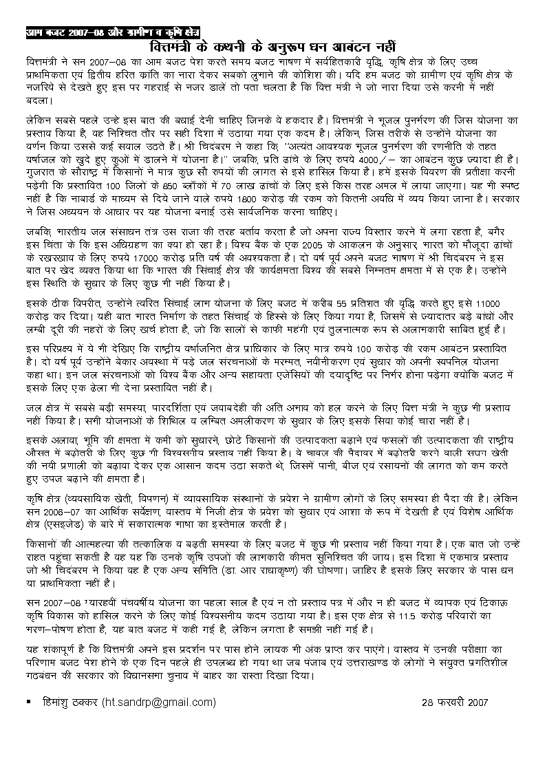 - SANDRP Comment on GOI Budget 2007 – (Hindi) – March 2007