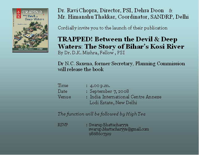 - Book Release: TRAPPED! Between the Devil & Deep Waters: The Story of Bihar’s Kosi River. By Dr. D.K. Mishra. See Invitation